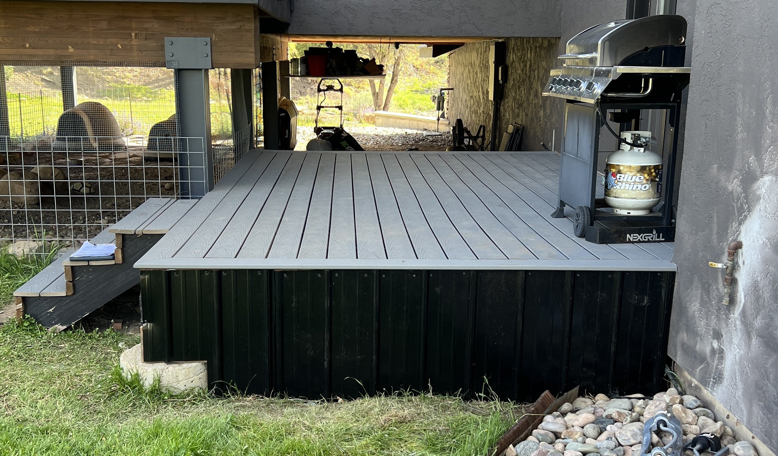 Underdeck Enclosures. This is an issue most homes with attached decks have and insurance underwriters catch every time. If your deck is less than 4 feet off the ground and the underdeck area is not enclosed, it offers an opening for dry leaves, pine needles and embers to accumulate, igniting the deck and the attached house. The open portion underneath the deck is enclosed with either 1/8 inch or less metal mesh or completely enclosed with a noncombustible material. The type of noncombustible material we use is decided by the homeowner.